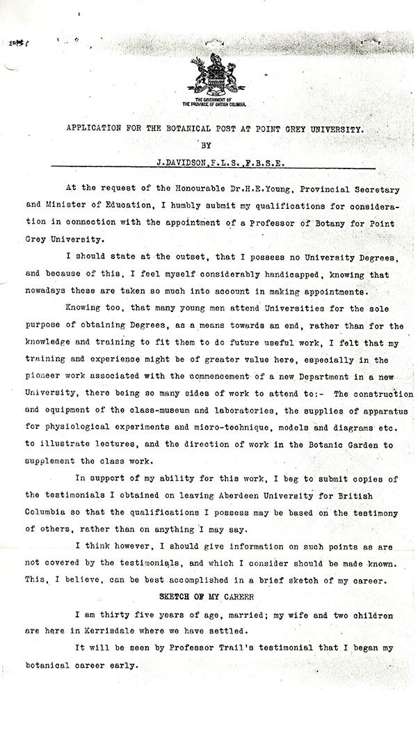 In 1911, a young Scottish botanist named John Davidson (1878-1970) emigrated from Aberdeen to Vancouver hoping to earn a professorship at the newly established University of British Columbia. His first position, however, came as a surprise. The Provincial Secretary at the time, Henry Esson Young, for which Essondale Hospital was named, appointed him BC’s first Provincial Botanist.