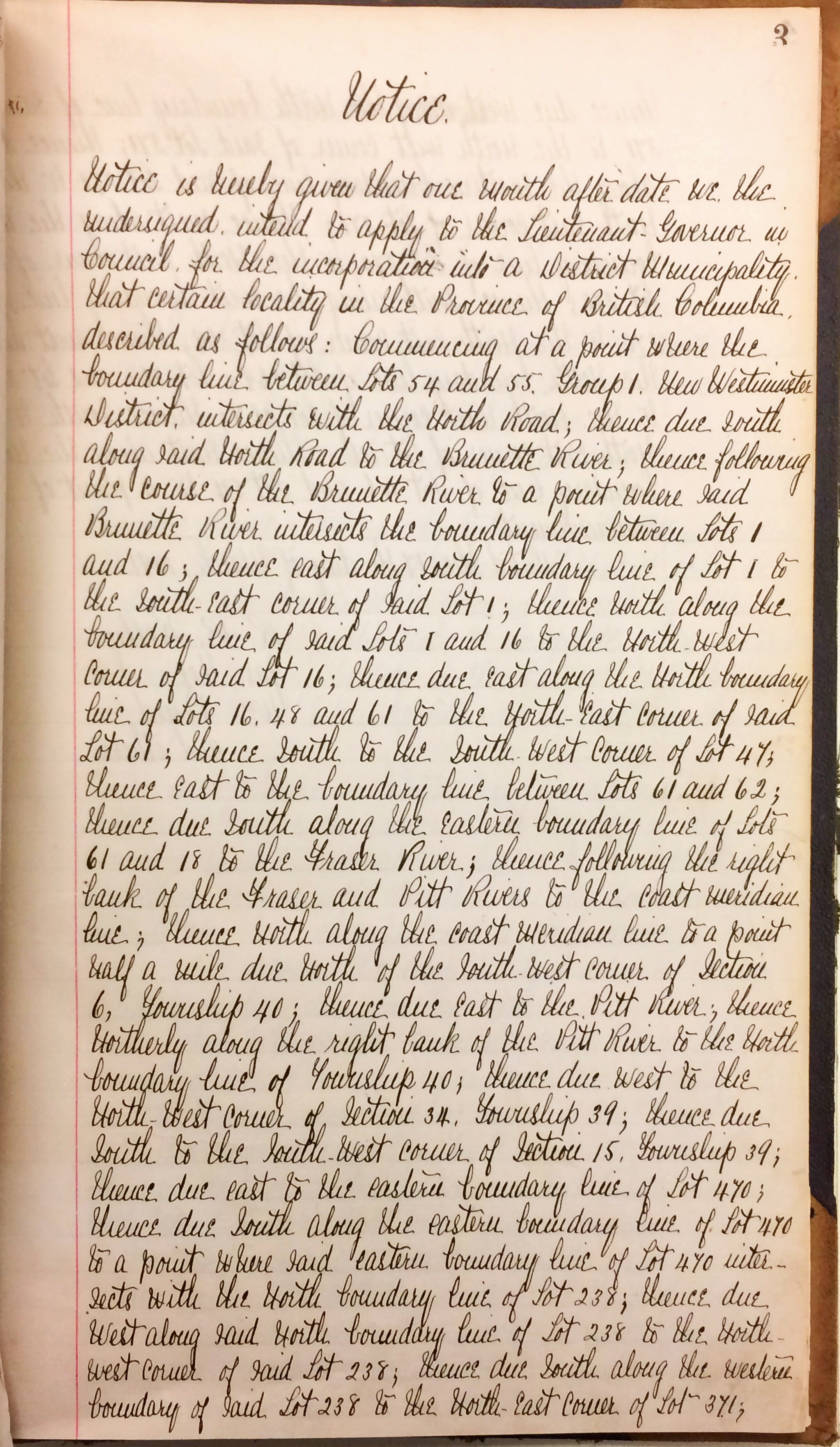 The Letters Patent outlined the boundaries of the new municipality in great detail and were described in terms of the District Lots, for example: